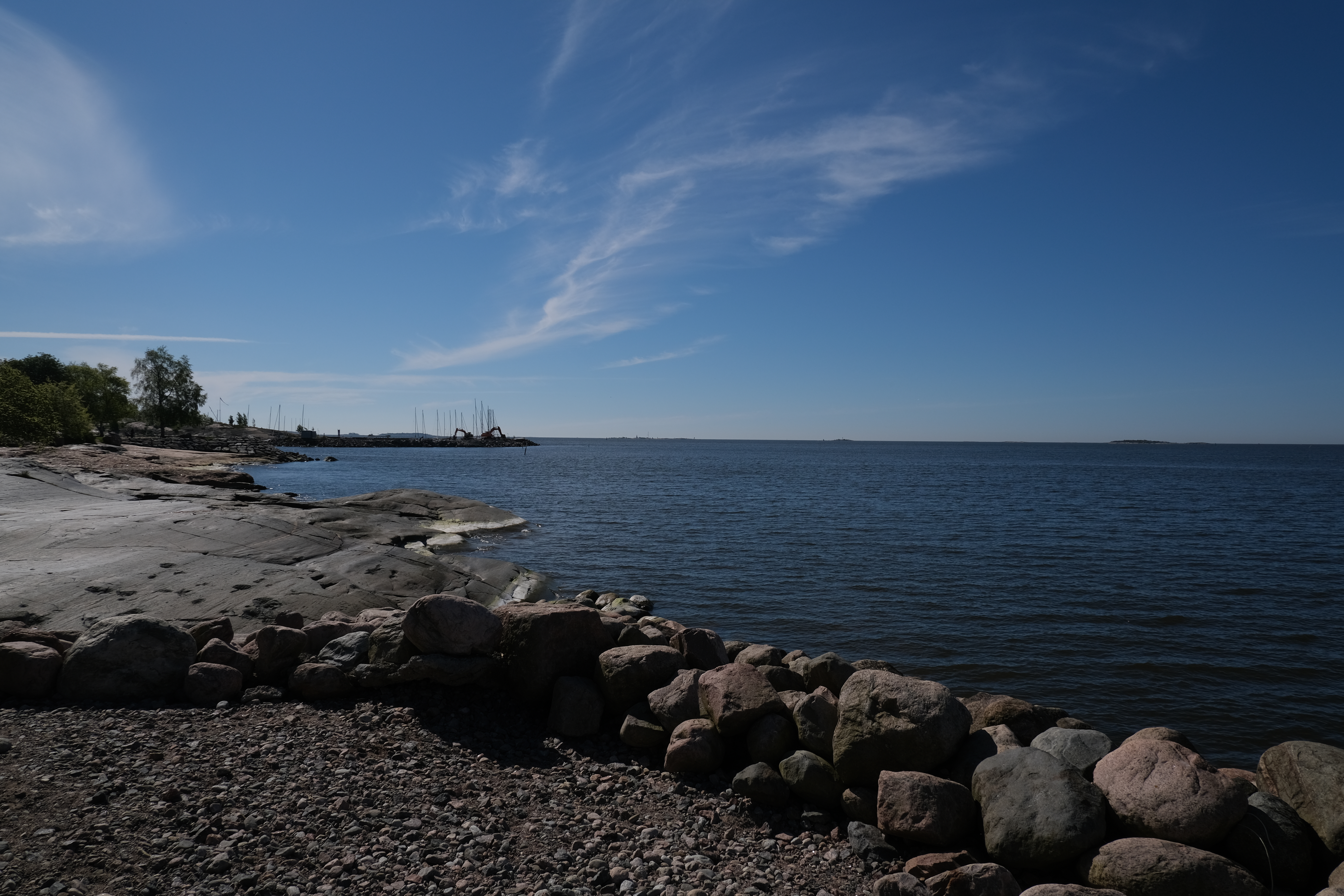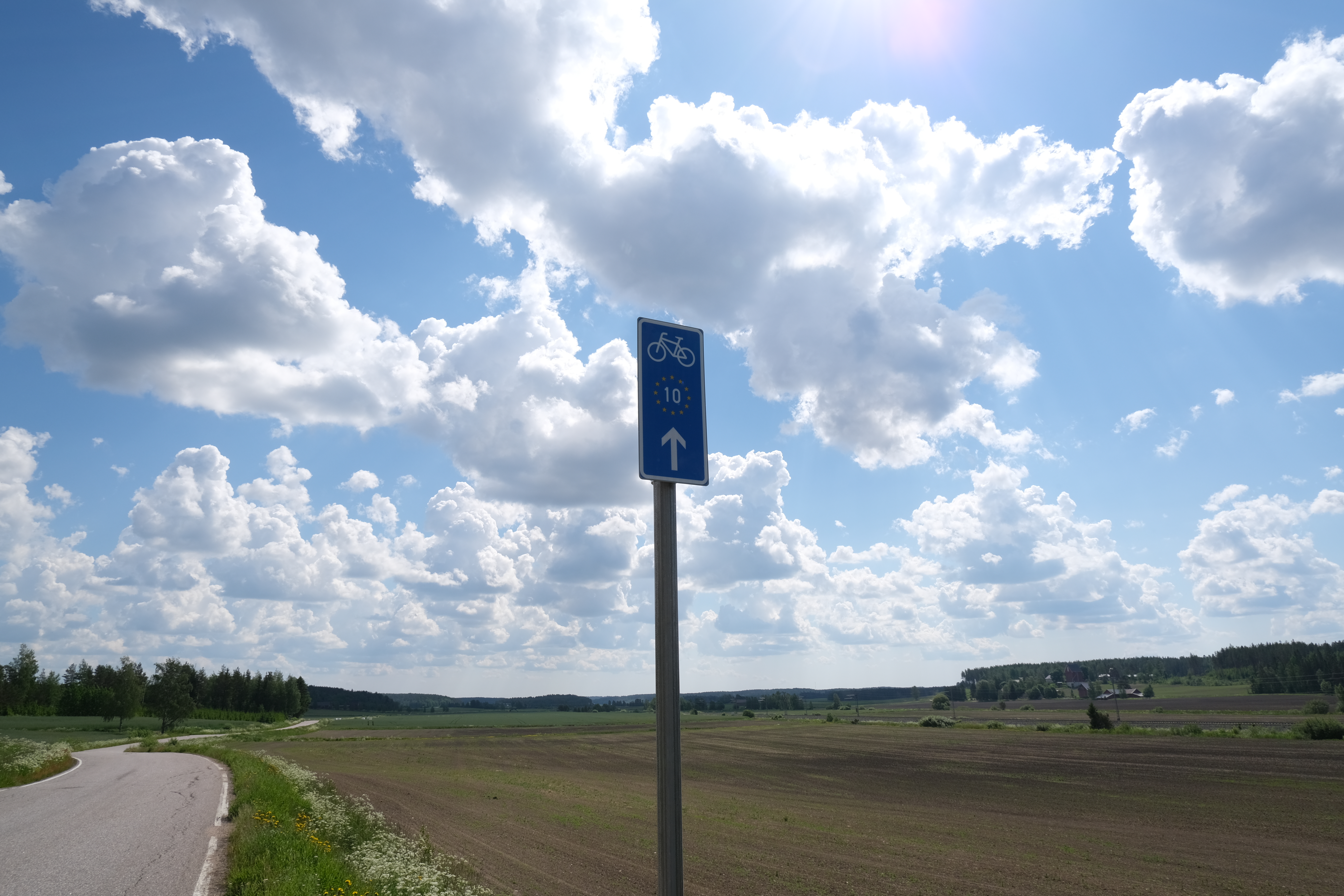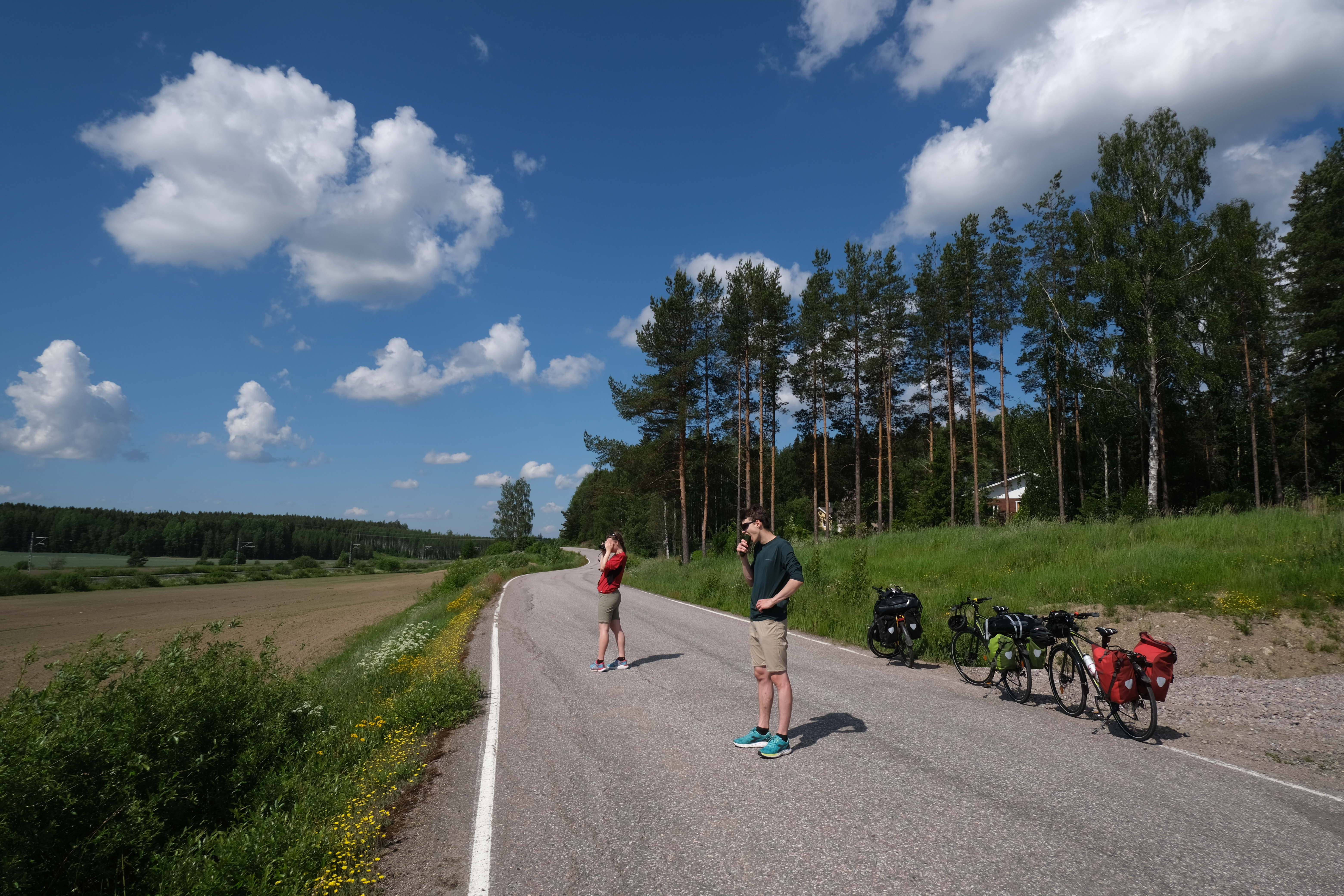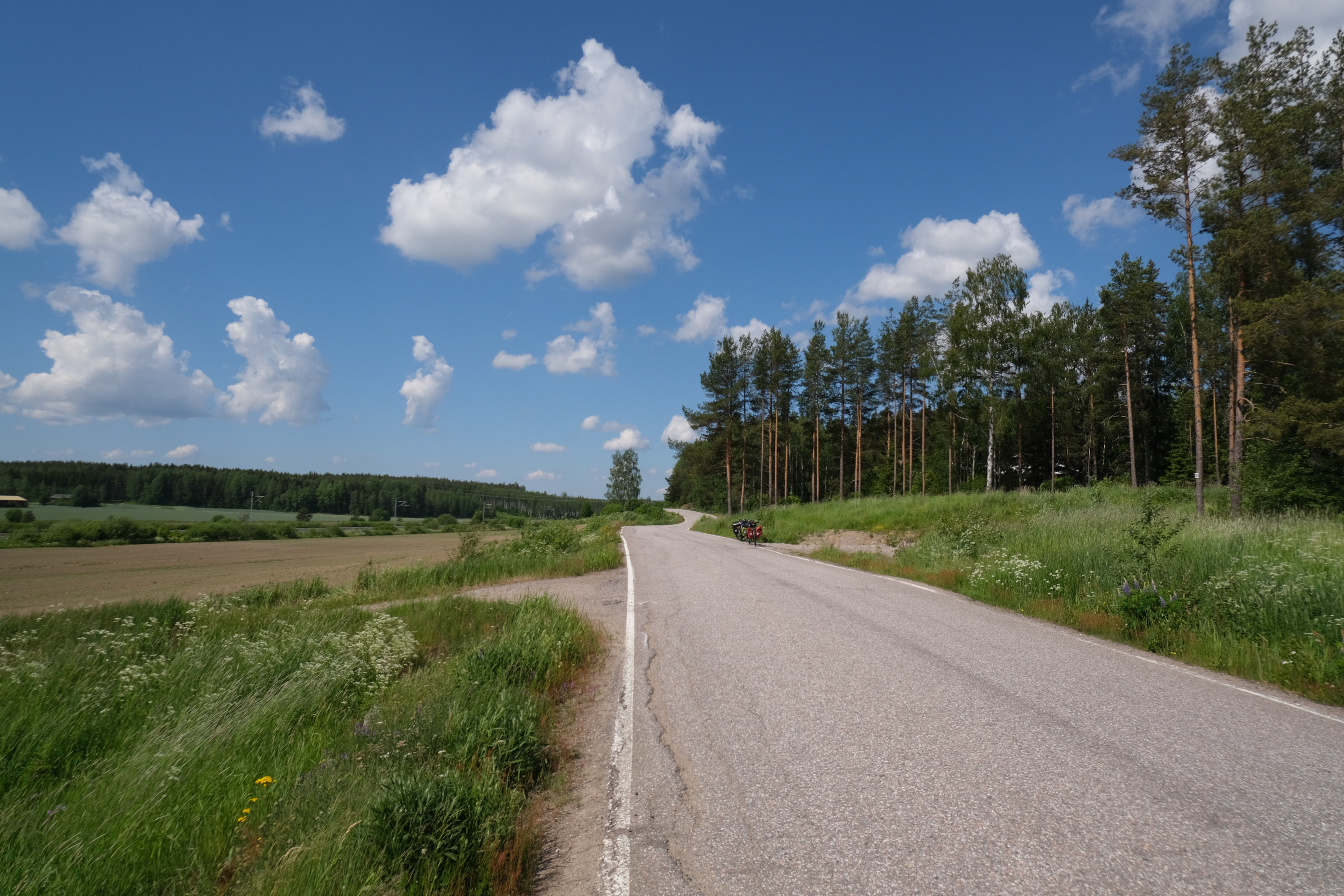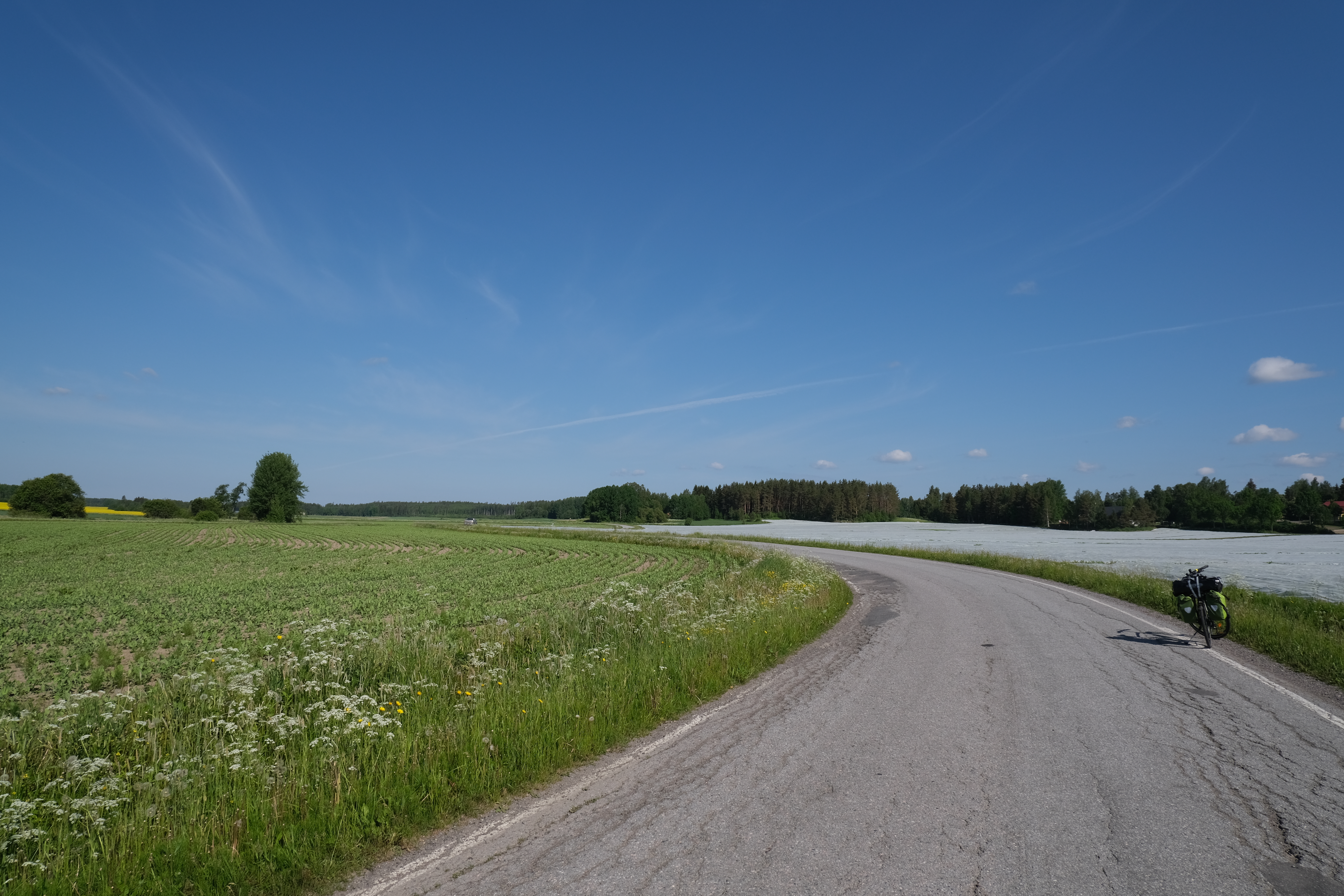 Our first goal was Degerby. We didn’t want to go too hard on the first day and the odd 60kms it would be sounded like a good start. The first kilometers were very smooth riding, which was to be expected considering we were heading towards Espoo, which would mean never really leaving the populated area. Even if we had to cycle on the bike path alongside the high all the way to Espoo, the view was still very pretty with the little islands along the coast and the scenic bridge segments. After a quick top up of on-the-road-snacks and water in we kept moving, now heading to Kirkkonummi. For the first time we left the populated area behind us and were greated by wide open plains, forest on the horizon and hills. Lots of hills. This will be a theme here. Hills. People say Finland is flat but what the mean is that it’s a mostly low altitude country. Because it most definitely is not flat. On our first day we accumulated 561 meters of elevation gain without every crossing 27m above sea. It really is quite curious. So on our way to Kirkkonummi I made my first acquaintance with the roller-coaster that is Finland. Short and steep climb and speedy short descent. Rinse and repeat. Once in Kirkkonummi we used a trick I’ve been told about by the Swiss friend I made on the train to Travemünde. Using the graveyard as a way to get to fresh water. Where there is a graveyard there is a hose. And water is gold now that we’re on the road. Other than that and a bit of a longer break to get some food in we didn’t do or see a lot of Kirkkonummi before already heading out again with Degerby as our goal. From now on (and for most of our trip in Finland) we followed the cycling route 10. It lead us through more rolling forests and plains, quickly making me feel like I’ve entered a far away abandoned fantasy land. The quiet and peace, the sheer vastness. It demanded for a photo break.
