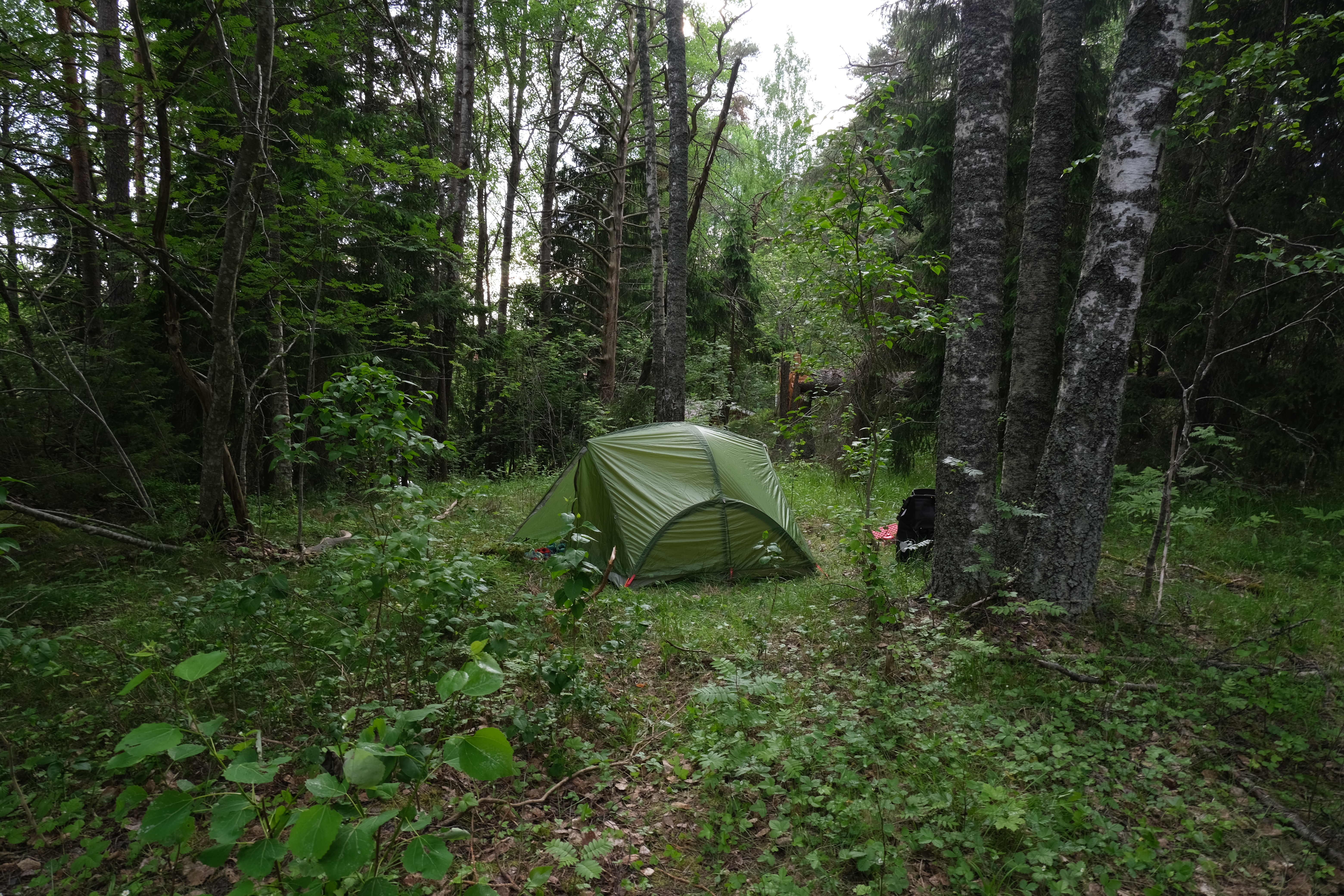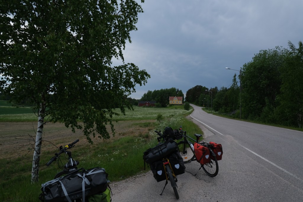Shortly after we made our first acquaintance with what Finland calls “main roads”. They are basically big, two laned roads that act as a connector of smaller settlements to the bigger cities and towns in Finland as well as roads that can be used to get from one major area to the other without using the highway. You are allowed to cycle on them and there is a thin side strip but depending on how busy the road is, it can be quite tense. And for our first day with my two quite exhausted friends it made for a very anxious last bit of road before finally making it to Degerby. From there we went looking for a suitable place to wildcamp, which we eventually found not far off from the village near what seemed like a little water filtration or other service hut. We set up our tent and realized we’re running low on water if we wanted to cook the rice we bought. So Frida and I went to the nearest houses where we found a wonderfully sweet man building his new garage who let us fill our bottles with his hose. We had a little chat and he even offered us to come again in the morning to fill up once more before heading back onto the road. For the sake of my mum’s sanity I’ll leave out the details of how we almost blew up the gas canister and just mention the superb rice Jascha managed to serve. With some nuts and spices he managed to make extravagant camp food. I’m not complaining. We had a wonderful chat about tons of stuff and then went to bed. Just as we all closed our eyes we heard the sounds of massive movement really close to our tent. We were all immediately really scared, especially when we didn’t see any human nearby when peaking out. The bones of a deceased animal not far away we discovered when peeing didn’t help the situation. I for one couldn’t really sleep that night. Not the smoothest start to wildcamping.
