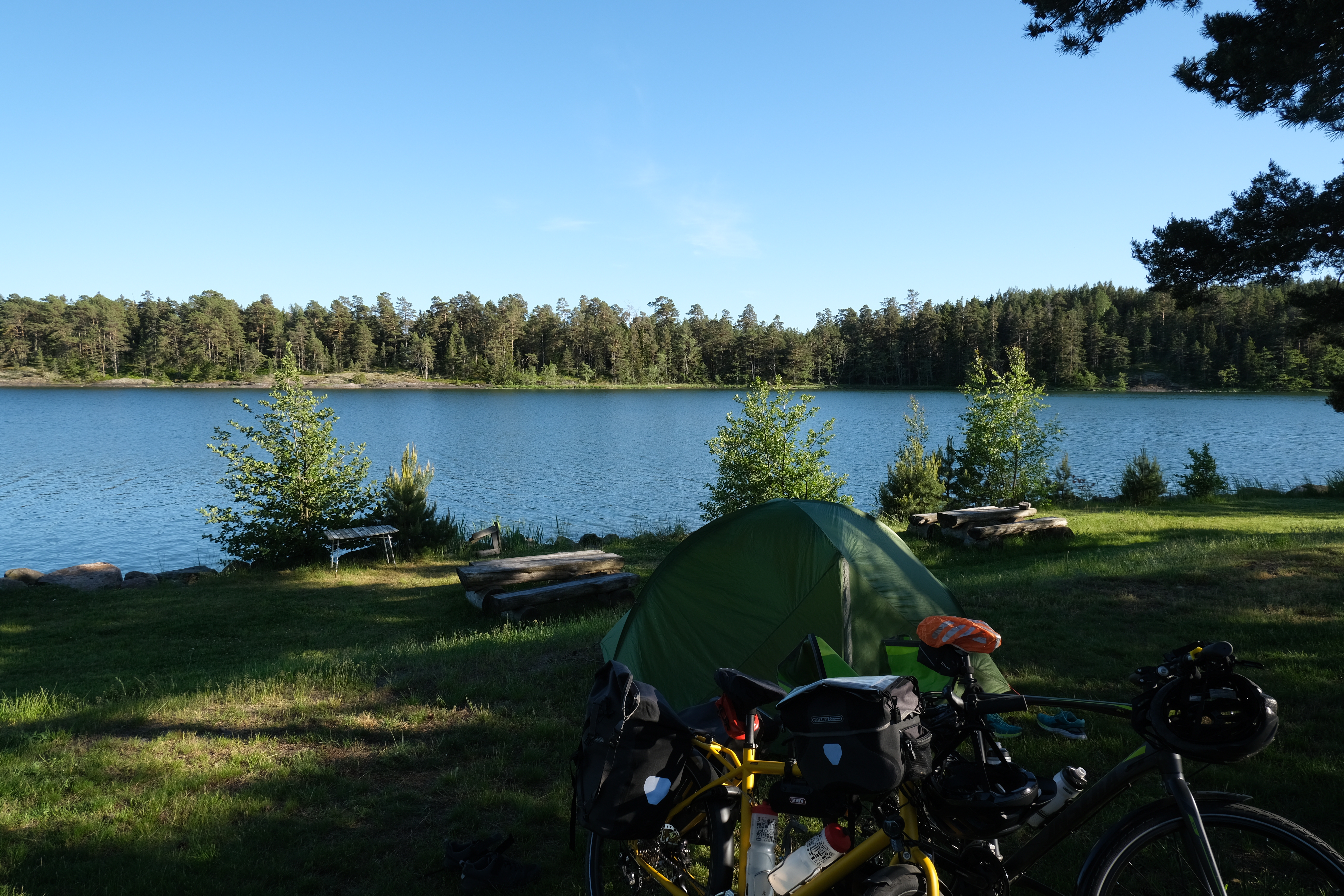 The archipelago just doesn’t stop blowing me away with its rock formations and pine forest. The little islands everywhere and the sea cutting into the land. Just out of this world. And so it continued. Or it only got better. When we went through the island of Nagu we met the other side of the archipelago though. The wind. It was warm but even I, who tends to always be warm, had to put on layers to make sure I don’t catch a cold. And one had to work for their kilometers. Especially since after Nagu the road to the port was blocked due to an accident and we had to take an unpaved detour. Nonetheless we made it to the next ferry that took us from the island of Nagu to the island of Kyrklandet. From there we took a bit of a longer ferry to get to Kittuis where we would set up tent at a camp ground just next to the port. It was the best decision ever! The camp ground had a scenery that was truly not out of this world. I got so lost in the moment there, felt like I could touch infinity. Possibly the most magical evening so far.